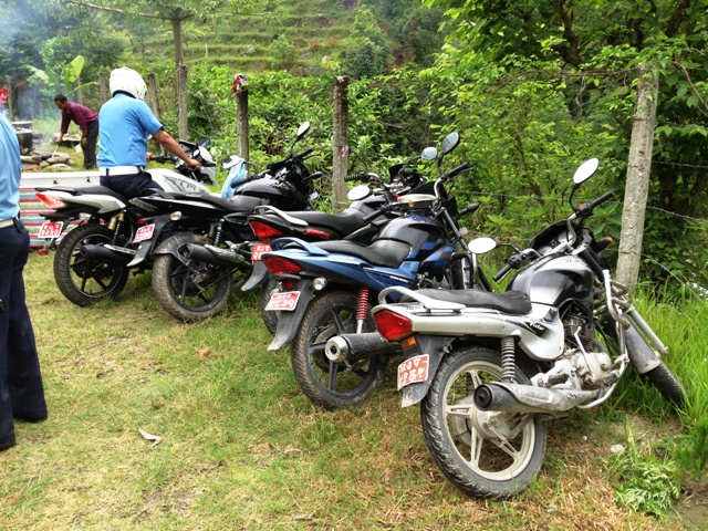 かなり荒れた道を4WDで走破した先の村の施設で昼食を頂きました。こっちでは偉い人から順番に食事を頂くらしく、ゲストとして政治家や村の重鎮達とともに頂きました。僕らが式典会場に向かうのを見送るために集められた子供たちは、その間黙ってみていました。日本との文化の違いを感じた瞬間でした。その食事の会場で警察のバイクを見つけました。インドのメーカーみたいですね。