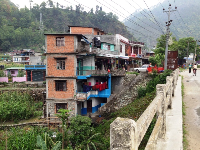 バズン村の河のほとりの高層住宅です。緑豊かな場所にレンガ色や水色がよく馴染んでいますね。
