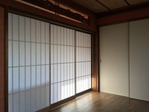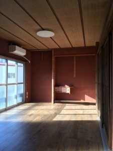 畳だった居間に床を貼りました。そのままの床の間に合わせて、ビンテージ調の床材にしました。
