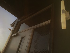 玄関はアルミのフラッシュドアです。レトロな玄関周りに合うようにLED照明もクラシックなフォルムのものにしました。